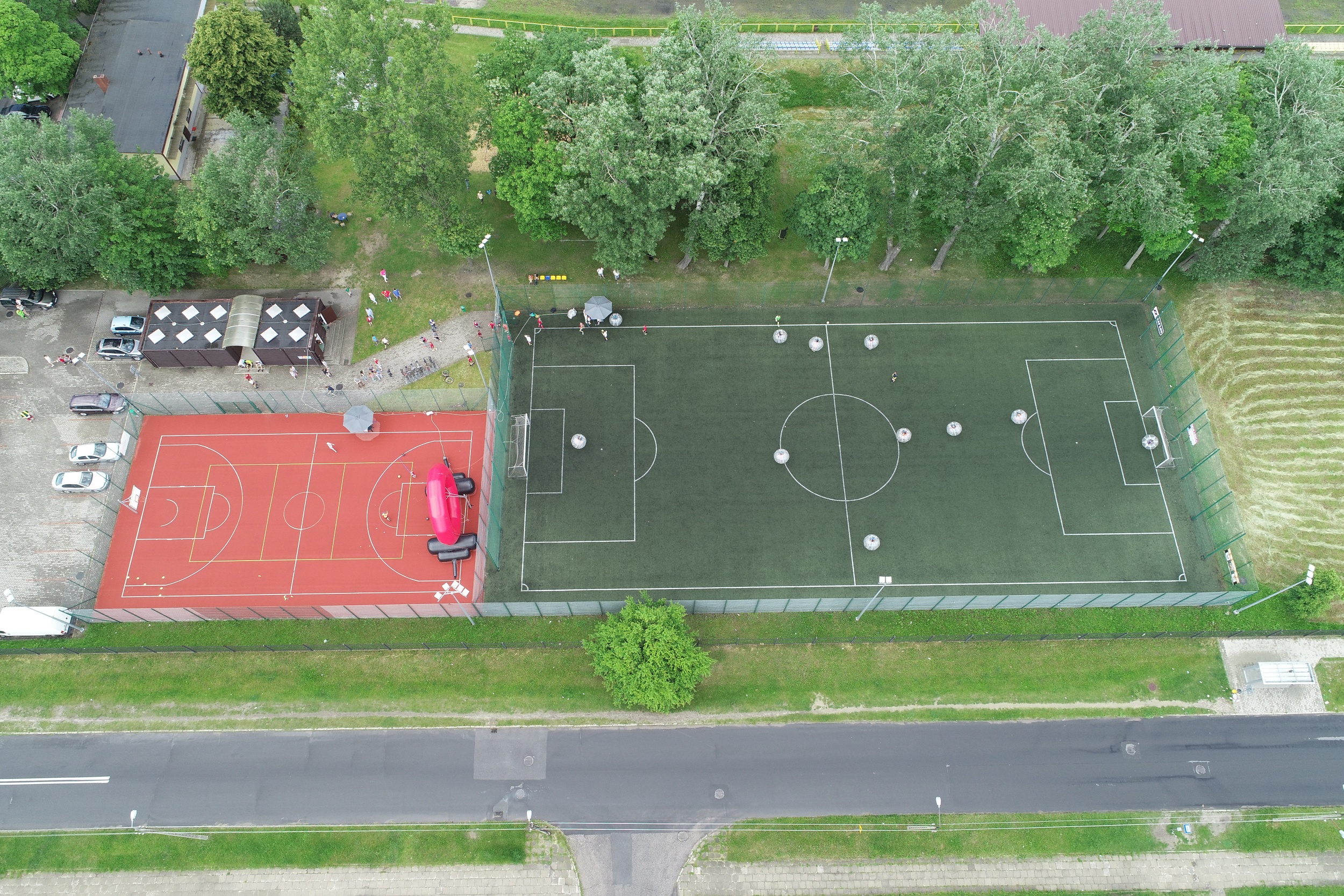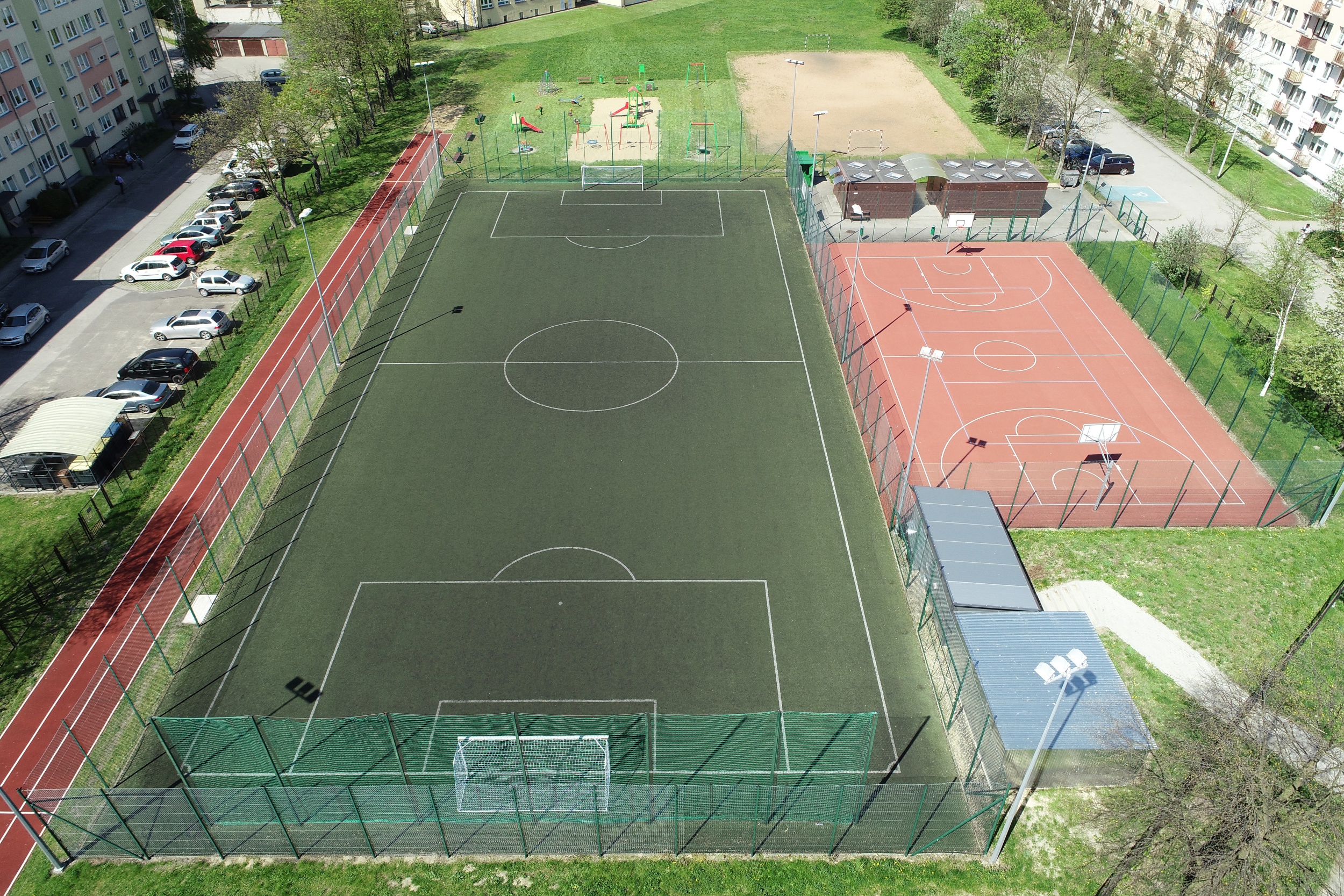 - Pole do gry w piłkę nożną o wymiarach 62,00m x 30,00m z nawierzchnią syntetyczną – sztuczna trawa wraz z dwiema aluminiowymi bramkami o wymiarach 5m x 2m. Boisko w pełni ogrodzone. Oświetlenie stanowi sześć masztów wraz z naświetlaczami.